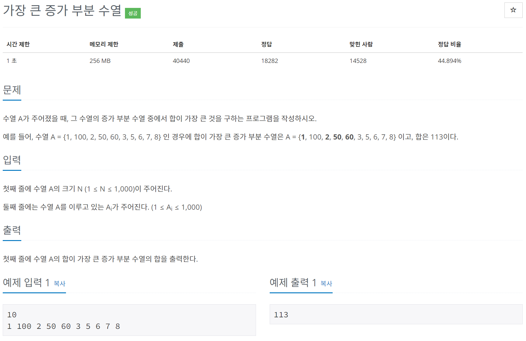 수열 A가 주어졌을 때, 그 수열의 증가 부분 수열 중에서 합이 가장 큰 것을 구하는 프로그램을 작성하시오. 예를 들어, 수열 A = {1, 100, 2, 50, 60, 3, 5, 6, 7, 8} 인 경우에 합이 가장 큰 증가 부분 수