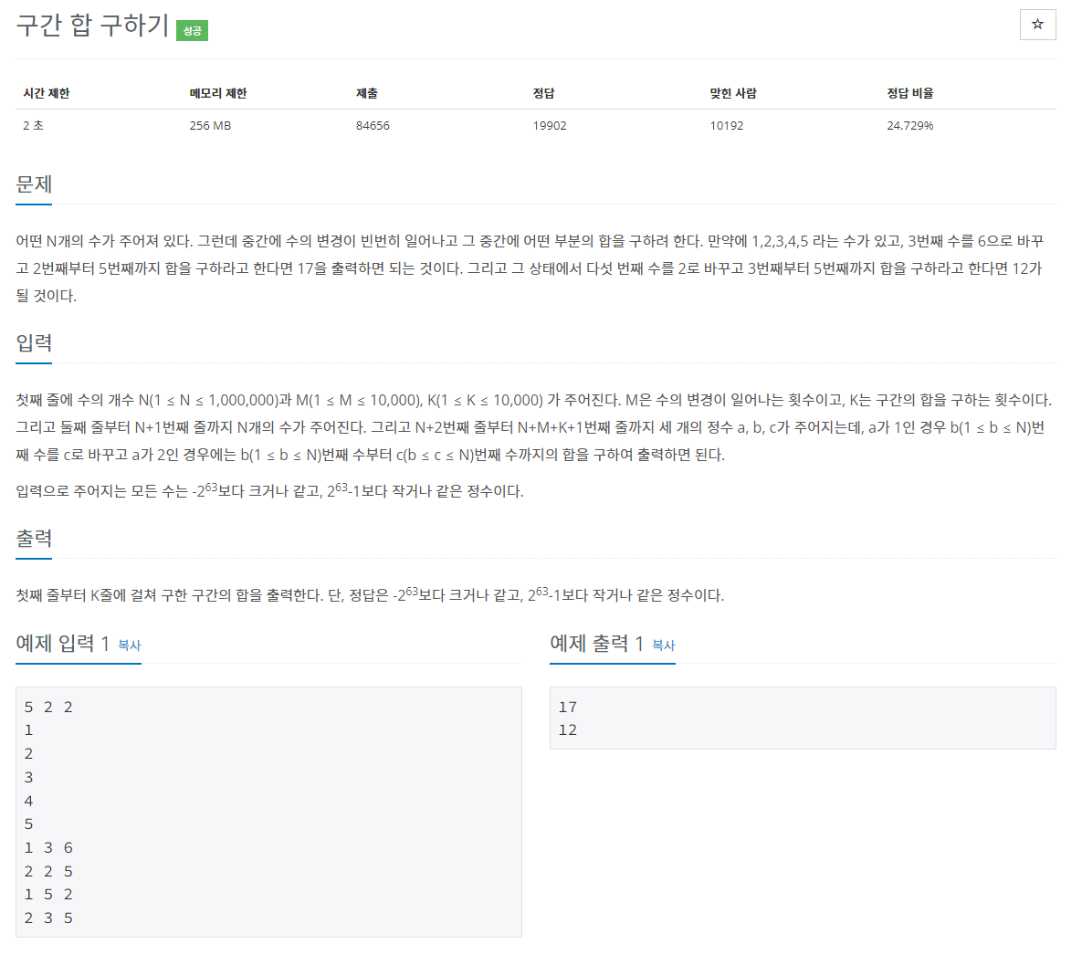 첫째 줄에 수의 개수 N(1 ≤ N ≤ 1,000,000)과 M(1 ≤ M ≤ 10,000), K(1 ≤ K ≤ 10,000) 가 주어진다. M은 수의 변경이 일어나는 횟수이고, K는 구간의 합을 구하는 횟수이다. 그리고 둘째 줄부터 N+1번째 줄